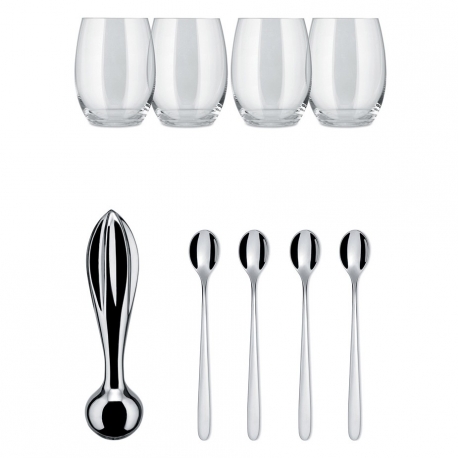 Alessi bar sættet består af den elegante stål citruspresser, 4 lange cocktailskeer samt 4 tumbler glase krystal.   (Læs mere)